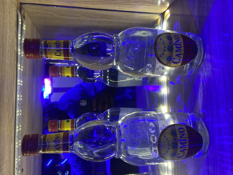 Three bottles of Camino Tequila Real are displayed horizontally with blue LED lighting. The bottles are clear with a distinctive shape and a label indicating they are imported. The backdrop includes a wooden panel on the left side with additional LED strip lights. A faint reflection of a person holding a phone can be observed in the background, giving the impression that the photo was taken in a mirrored setting.
