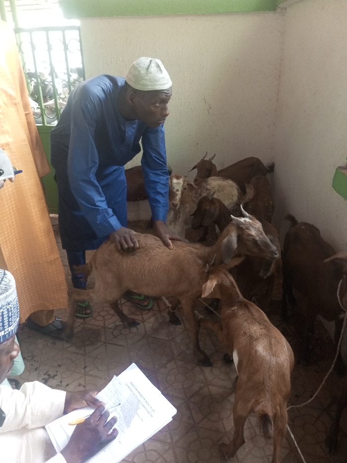 man wearing a white hat and blue clothing petting a brown goat. The man is standing in a room with tiled floors and white walls. There are six goats in the room. The man is petting a brown goat and another goat, with a white patch on its side, is standing behind it. The man is looking at the goat he is petting. There is another man, wearing a white hat and a white robe, sitting on the floor in the foreground, writing on a piece of paper. The paper reads "Technical Assistance Manual for the..." There is a green wall behind the goats and the man. The location is Birnin Kebbi, Nigeria. The coordinates are 12.451 latitude, 4.207 longitude.