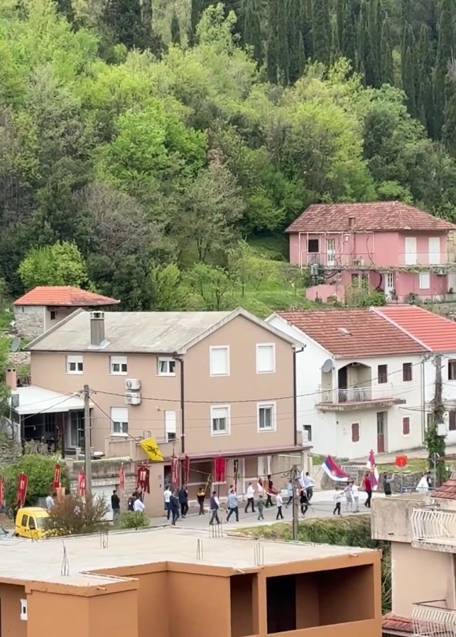 group of people walking down a street in a small village. The people are carrying flags and banners, and they appear to be participating in a procession or parade. The village is located in a hilly area, and there are trees and vegetation visible in the background. The houses in the village are mostly two-story buildings, and they are painted in a variety of colors. The weather appears to be overcast.