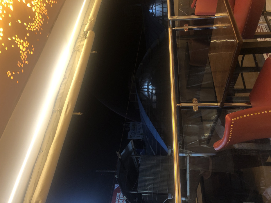 A tilted view shows a portion of a ceiling with decorative lights, an extended curtain-like fabric, and a scene from outside, seemingly at night. A reflective table with gold trim is visible, paired with red chairs. The outdoor view includes signage and architectural elements, suggesting an urban setting at night.