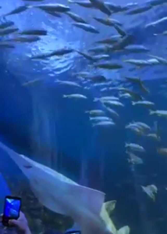 n aquarium from a viewer’s perspective. Several people are standing in front of a large glass panel, holding up their phones to record the scene. Inside the aquarium, there's a large group of fish swimming near the surface. Below them, a large sawfish swims by. The water is blue, and light is streaming in from the top, creating reflections on the surface.