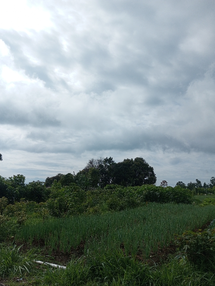 A field of green onions stretches across the foreground, bordered by dense grass. Behind the onions, shrubs and trees form a line, obscuring the horizon. A large, dark tree dominates the center. The sky is filled with heavy, gray clouds, suggesting overcast conditions. A white pipe is visible in the foreground amidst the tall grass.