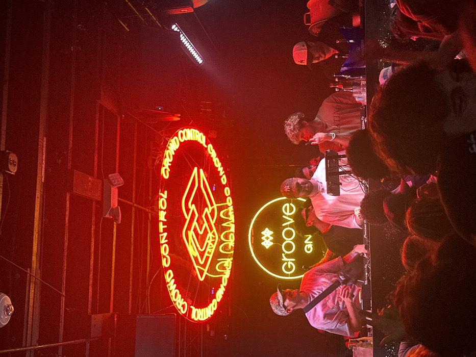 The image depicts an indoor nightclub scene at Groove Nightclub in Gainesville, United States of America, illuminated primarily by red artificial light