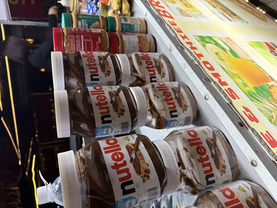 The image captures a retail display of food spreads at a market stall in Nam Hoa Lư Ward, Vietnam. The foreground is dominated by multiple jars of Nutella hazelnut spread, primarily in 680g containers, stacked two high in several instances on a metallic gray counter surface. Labels on the Nutella jars are visible, indicating "680 g" and featuring Vietnamese text. To the right of the Nutella, several jars of other spreads, likely peanut butter, are displayed with red and green lids. A clear plastic water bottle with a white cap is on the far left. Below the counter, a brightly illuminated display panel for the stall shows images of beverages and food, with the partial text "SMOOTHIE BR" visible. In the blurred background, a person with short, dark hair, wearing a dark garment, is partially visible, positioned behind the counter, engaged in an indistinct activity. The setting appears to be an evening market or an artificially lit indoor environment.