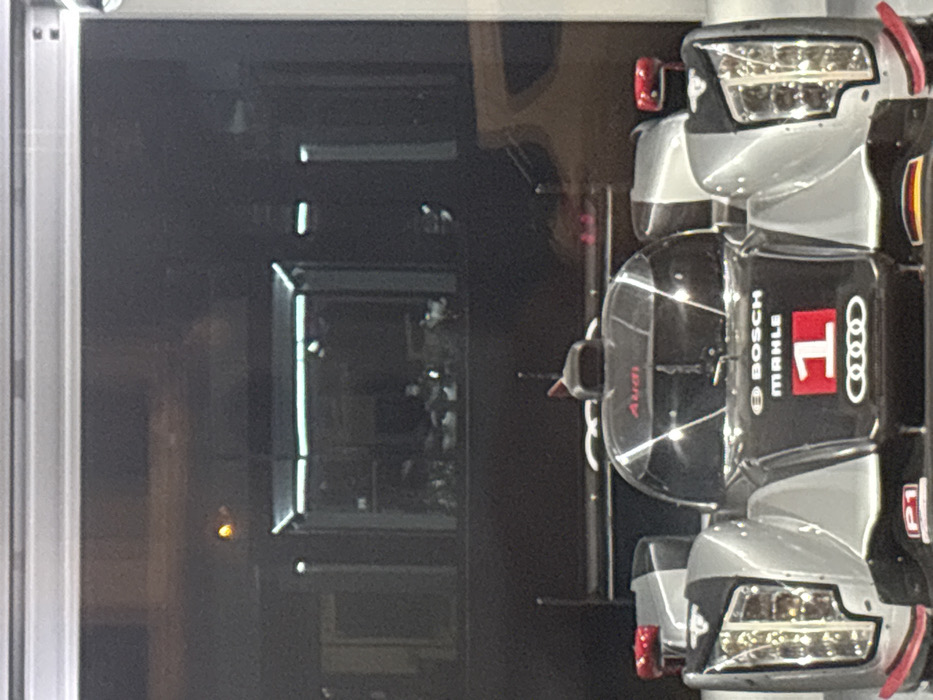 A silver Audi race car is prominently displayed. The car features branding such as "Bosch," "Mahle," and the Audi logo. It is number one and appears to be a P1 class vehicle. The background reflects an interior space with windows. The setting suggests the car may be a collectible item inside a display case, captured with its exterior lights visible.