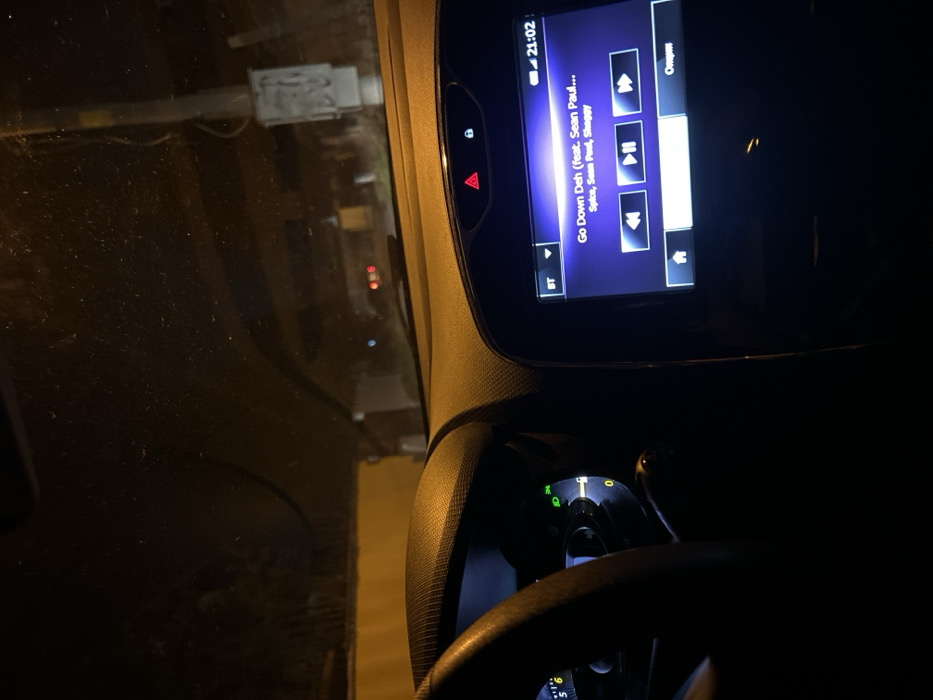 The image displays the interior of a vehicle at night, captured from a perspective consistent with the driver's seat, looking forward through a dusty windshield. The scene is situated in Voluyak, Bulgaria. The foreground features the vehicle's dashboard, with the left portion showing a section of the steering wheel and an illuminated instrument cluster where a green indicator light is active, suggesting headlights or parking lights are on. To the right, a central infotainment system is prominently displayed and active. It shows the song "Go Down Deh (feat. Sean Paul..." by artists Spice, Sean Paul, and Shaggy, with playback controls for skipping and pausing. The time indicated on the screen is 21:02, and a Bluetooth (BT) connection icon is visible. Above the infotainment screen, a red triangular hazard light button is present. Through the windshield, the exterior environment is dark, indicating nighttime. Distant light sources are visible: a yellow-orange glow on the left, possibly from streetlights or buildings, and two distinct red lights further ahead, likely vehicle taillights or traffic signals. On the far right, a utility pole with an attached grey electrical box is discernible. No individuals are explicitly visible within the frame. The vehicle appears to be stationary or in motion within an urban or semi-urban setting.