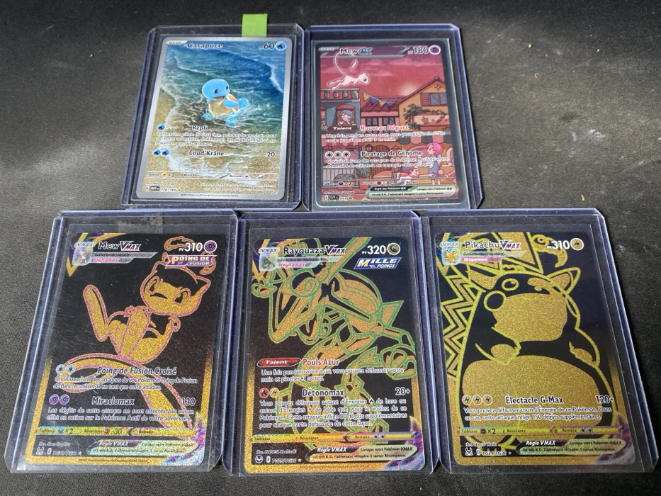 The image displays six Pokémon trading cards encased in clear plastic protective holders, arranged in two vertical columns on a dark, flat surface. The cards are oriented with their tops generally pointing towards the right side of the frame. The left column contains three VMAX Pokémon cards with a black background and golden, iridescent outlines. From top to bottom, these are: a Mew VMAX card featuring the attack "Poing de Fusion Croisé" with 310 HP; a Rayquaza VMAX card with green and golden outlines, featuring "Mille Poings" and 320 HP; and a Pikachu VMAX card featuring "Électacle G-Max" and 310 HP. The right column contains three additional Pokémon cards. The top card depicts a Squirtle (Carapuce) in a beach setting with waves, featuring the attack "Coud'Krane" and 60 HP. A small, bright green rectangular tab or sticky note is affixed to the right edge of its protective case. The middle card displays a Mew GX against a colorful background resembling a village or town, featuring "Piratage du Génome" and 180 HP. The bottom card in this column is largely obscured by the middle-left card but appears to be another Pokémon card in a similar protective case. The cards rest on an unidentifiable dark gray or black matte surface, possibly a desk or table, with minimal visible texture or dust. No people are visible. No actions or interactions are depicted; the objects are stationary. The specific location within the city of Toulouse, France, cannot be determined from the provided image.