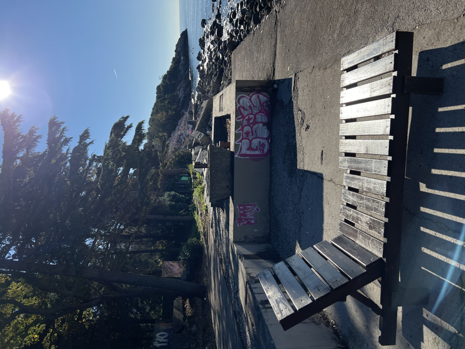 The image depicts a coastal scene in Kamenovo, Montenegro, under bright sunlight on a clear day. In the foreground, a dark-stained, slatted wooden lounge chair rests on a concrete surface, angled with its backrest slightly elevated, casting distinct parallel shadows. Behind the chair, a multi-level concrete structure runs horizontally across the mid-ground. The lower section of this concrete wall displays pink graffiti, including illegible tags. A large, dark gray concrete trough-like object sits on a higher concrete platform, surrounded by scattered concrete debris and rocks. To the left, a paved or dirt path runs alongside a dense line of tall, dark evergreen trees that form a wooded area. A concrete surface near the path displays faint graffiti, including the numbers "170." To the right, the calm, blue Adriatic Sea meets a rocky shoreline. A green, tree-covered headland extends into the sea in the distance. The sun is prominently visible in the upper right quadrant of the sky, which is clear blue, and a faint white aircraft contrail is visible. No people or animals are present in the scene.