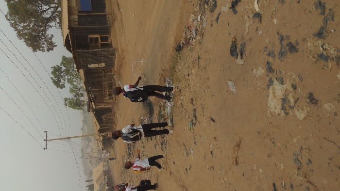 A dirt road in a developing area shows children in school uniforms walking with backpacks. Makeshift structures line the road. Litter and debris are scattered along the roadside and in the dirt road itself. Utility poles with power lines are visible. The overall scene suggests a poor or impoverished community. The sky is hazy or dusty.