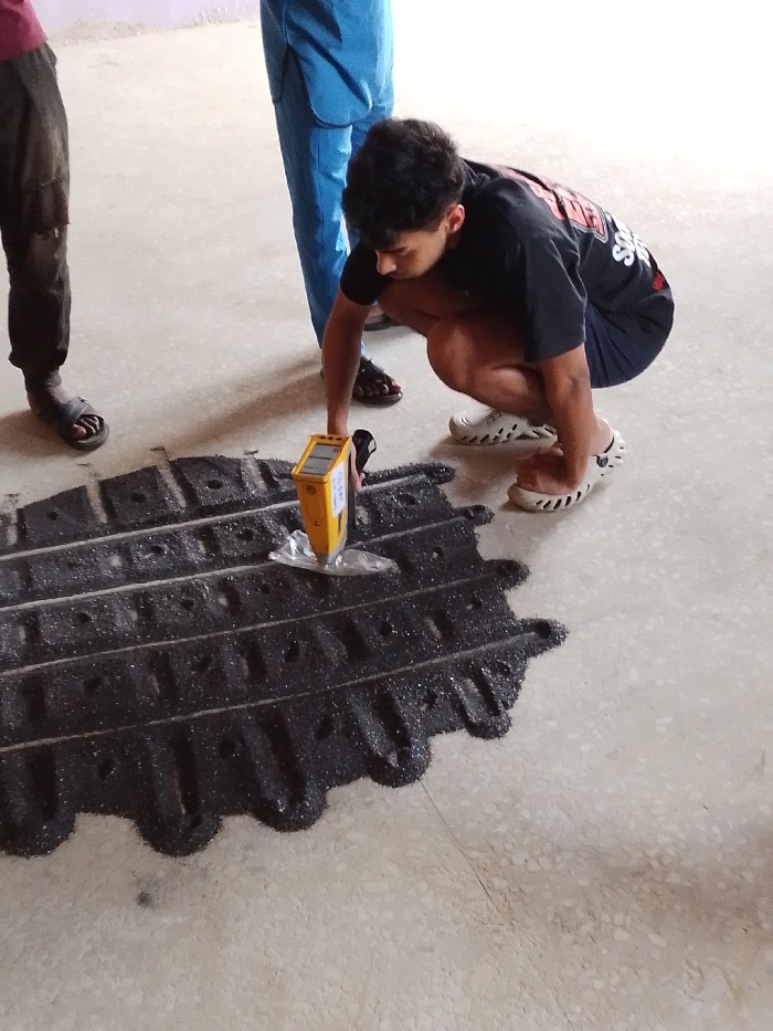 In Oko Erin, Nigeria, an indoor scene displays three individuals engaging with a dark, textured mat. A young male, dressed in a black t-shirt, dark shorts, and white clogs, is in a crouched position, actively holding a yellow handheld electronic device. This device, featuring a display screen and a metallic, trowel-like attachment, is pressed against the surface of the dark mat. The mat is composed of connected segments with parallel raised ridges and rows of circular indentations, presenting a granular or coarse texture. The lower extremities of two other individuals are partially visible: one person stands directly behind the crouched male, wearing blue trousers and dark sandals; another person stands to the left, clad in dark, worn pants and dark sandals. The activity occurs on a light-colored concrete or tiled floor, within a room exhibiting light-toned walls in the background.