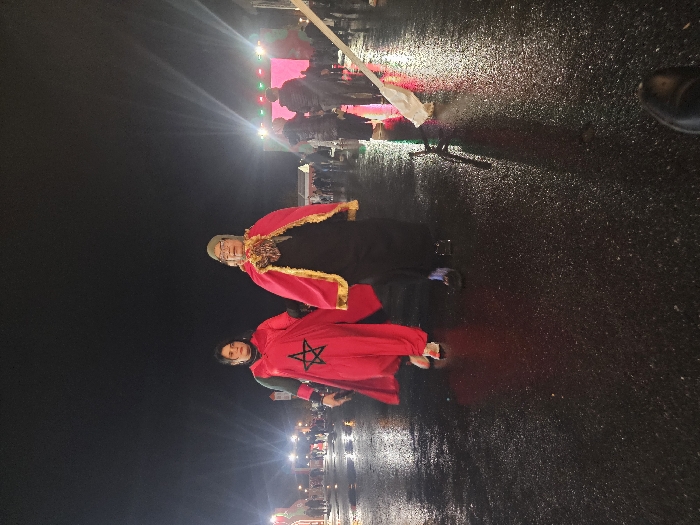 Two people stand at night on a wet surface, wearing what appears to be capes. The lower person has a red cape with a star design. The other person's cape is red with a gold trim. In the background are indistinct figures and bright lights. The location is dark and looks like a public area. A shoe can be seen on the upper right.