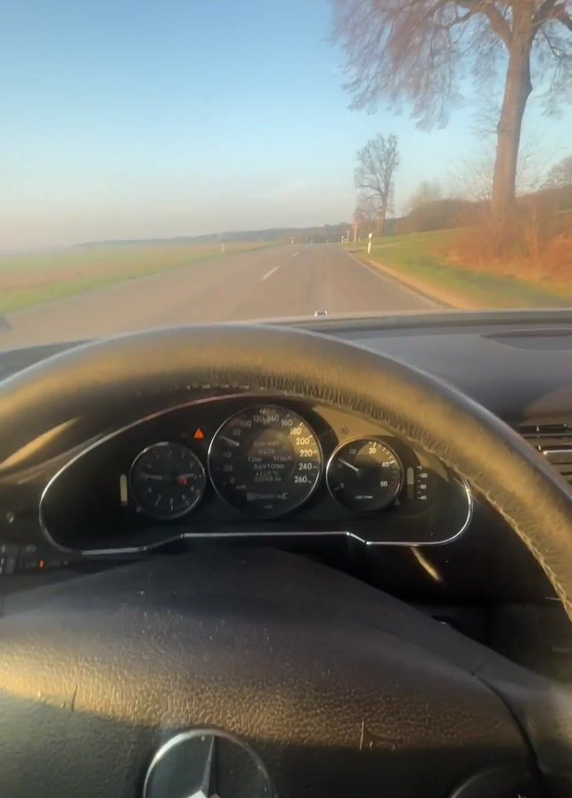 driver’s POV of a car ride on a rural road. The car's dashboard is visible, with a speedometer that goes up to 260 km/h. The steering wheel has a prominent Mercedes-Benz logo. Outside, the road is straight, flanked by fields and trees, with a clear blue sky above. A warning sign is also visible on the right side of the road. Electronic music plays in the background.
