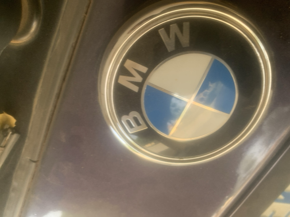 A close-up, oblique view captures a BMW emblem affixed to the dark purple surface of a vehicle