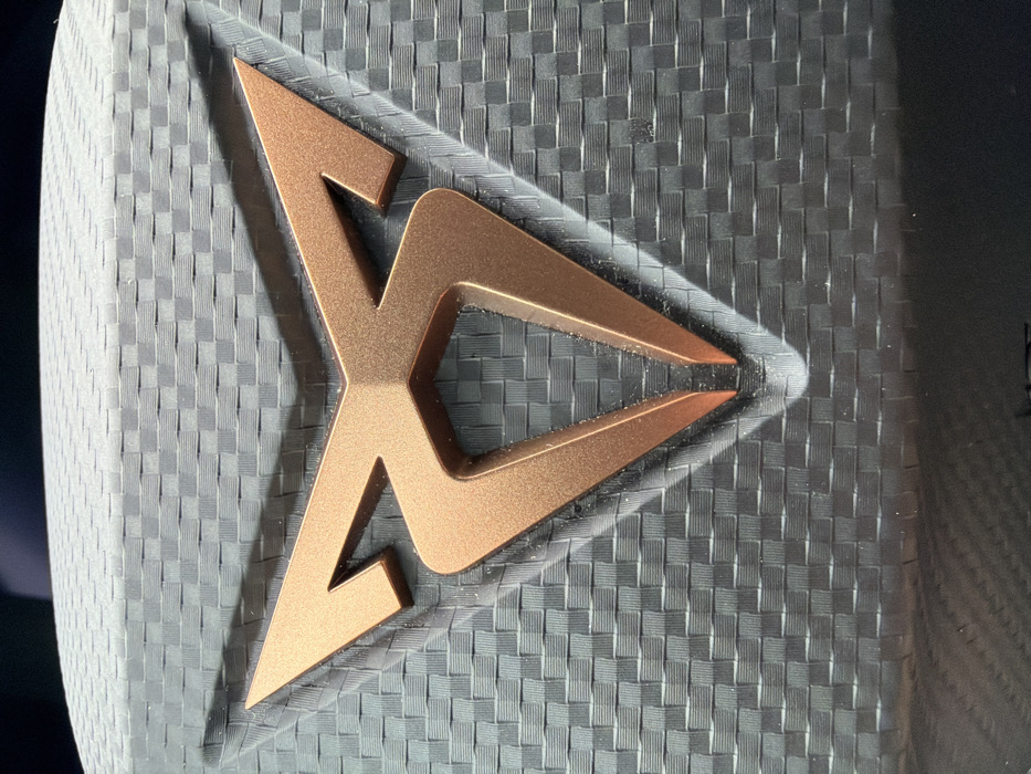 - "A close-up photograph depicts a three-dimensional, bronze-colored Cupra emblem centrally positioned on a dark gray textured surface exhibiting a woven, carbon fiber-style pattern" by FM-ayK6f1, licensed under CC BY 4.0