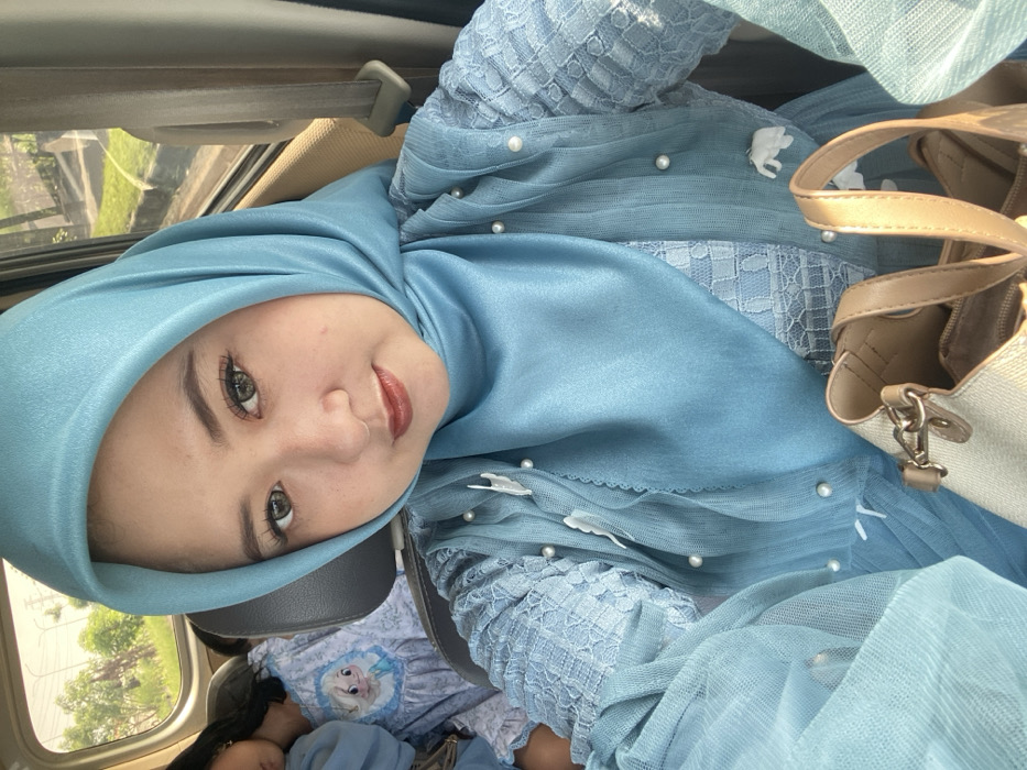 A female subject, appearing to be an adult of East Asian ethnicity, is depicted in a close-up, chest-up selfie taken inside a vehicle. She wears a light blue hijab, a matching long-sleeved dress or tunic with intricate lace patterning, and a sheer outer layer adorned with white pearls and white petal-like appliques. Her face features cosmetic enhancements including defined eyebrows, eyeliner, light brown lipstick, and light grey/greenish irises, consistent with colored contact lenses. Her gaze is directed at the camera with a neutral expression. In the left background, a second individual, likely a child, is partially visible in an adjacent seat, wearing a light blue garment with a visible "Elsa" character graphic from Disney's "Frozen." A light beige handbag with tan straps is visible in the lower right foreground. Through the vehicle's window, an outdoor environment with green foliage and a utility pole is visible under daylight conditions, suggesting the vehicle is on a street or roadside. This scene is located in Pamotan, Indonesia.