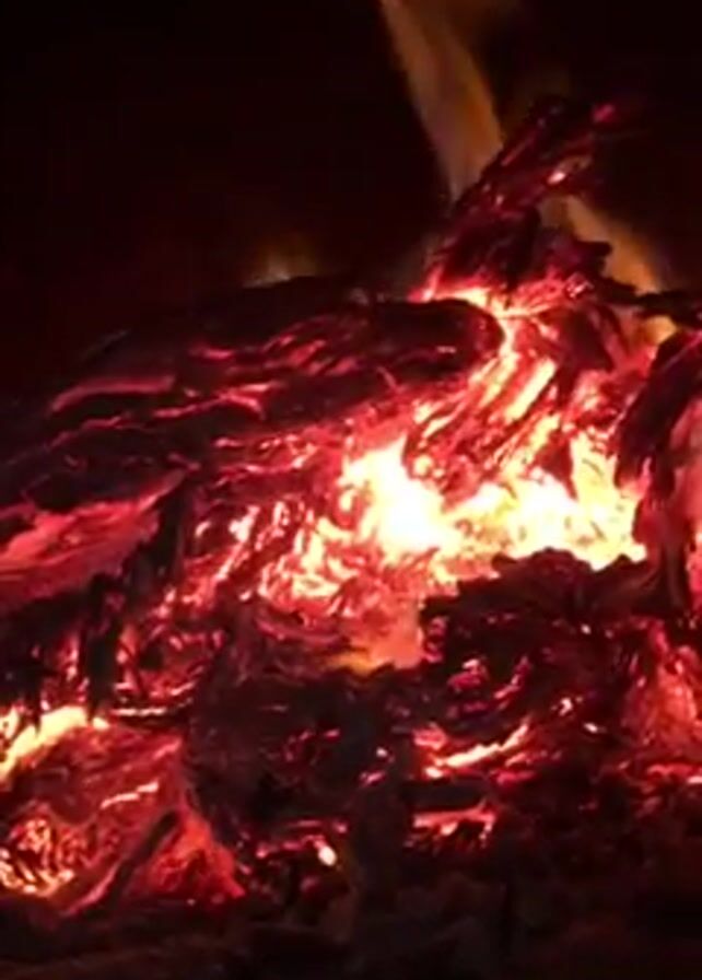 The video displays a close-up view of burning embers and small flames in a dark environment