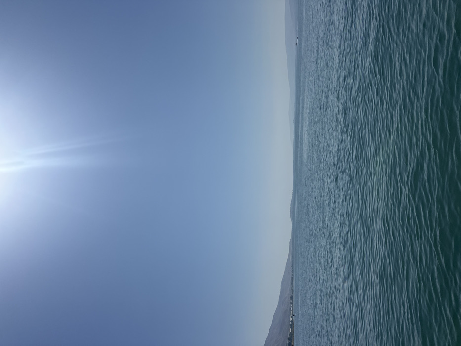 The image depicts a wide outdoor scene over the Sea of Galilee, located within the Emek HaYarden Regional Council, Israel, under a clear, bright sky. The upper two-thirds of the frame consist of a light blue sky with a prominent sun flare positioned in the upper right, emitting visible rays of light. The lower third of the image is dominated by the greenish-blue water of the lake, which features numerous small, textured ripples across its surface. A distant, hazy blue-grey mountainous or hilly shoreline is visible on the horizon, extending from the left to the right of the frame. A single small, white boat is faintly discernible on the water near the distant right shoreline. No individuals or specific actions are visible. The environment indicates a clear, sunny daytime setting.