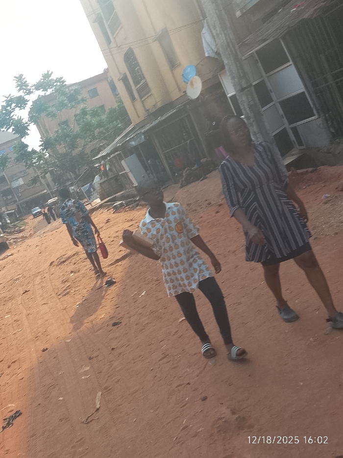 Three figures are walking on a dirt road in what appears to be an urban environment. The road is unpaved and appears to be a residential area. The buildings are worn. In the distance, more buildings and a parked car are visible. The foreground has a timestamp of "12/18/2025 16:02".