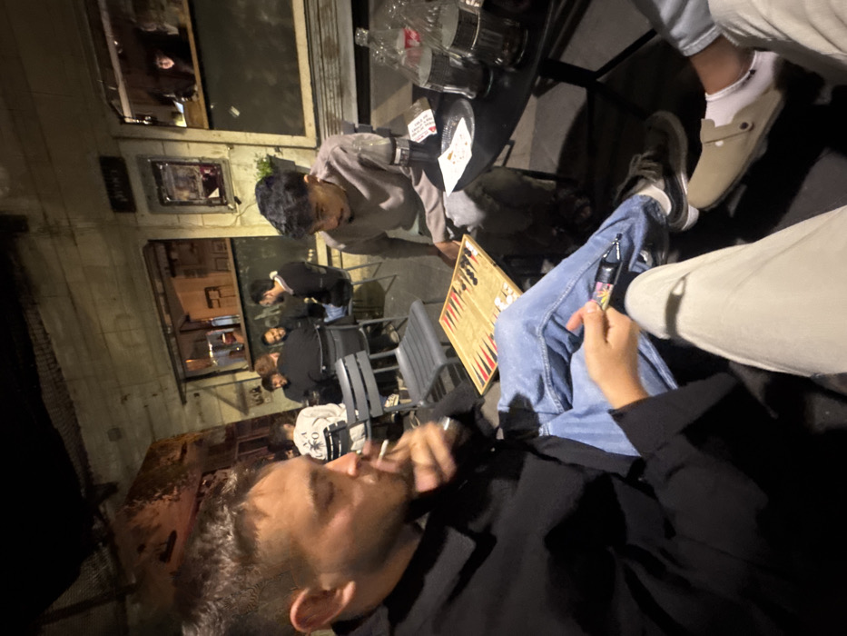 The image depicts a nighttime scene at an outdoor cafe or bar in Jerusalem, Israel, specifically identified by Hebrew signage reading "הבוסתן" (HaBustan), indicating its location in the Nachlaot neighborhood. In the foreground, a man with short brown hair, wearing a black collared shirt and blue jeans, is seen in profile on the left. He is actively smoking a cigarette, with visible smoke emanating from it. His left hand holds a small, colorful rectangular object. Directly opposite him, positioned to the right, a second man with dark hair and a mustache, dressed in a light brown long-sleeved shirt and dark pants, is seated, partially obscured. Between these two individuals, on a dark, square table, an open wooden backgammon board with red and black checkers is visible. To the right of the backgammon board, on the same table, are two clear glass bottles, one containing a dark beverage (likely a soft drink), alongside two empty glasses and a small black plate with a white napkin. In the mid-ground and background, the building facade features two window-like openings, possibly serving areas, through which several other men are visible inside, seated and interacting. A third man's legs, clad in light-colored pants and beige clogs, are visible in the extreme lower right foreground. The overall lighting is artificial, illuminating the subjects and the cafe interior. The left wall of the outdoor seating area features a large, indistinct mural or artwork. The setting is a casual social environment.