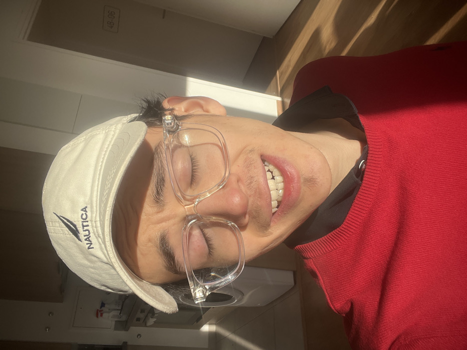 A male individual is depicted in a front-facing, waist-up indoor selfie in Villeneuve-d'Ascq, France. He wears a light beige baseball cap with the "NAUTICA" logo, clear-framed eyeglasses, a red long-sleeved sweater, and a black collared shirt. His eyes are closed or squinted due to strong direct sunlight illuminating his face from the right. He displays a slight open-mouthed smile, revealing his upper teeth, and has visible facial stubble. The background to the left shows a partial view of a kitchen area, including a white appliance and shelves with white bottles. To the right, a light-colored door is visible, bearing a dark plaque with the inscription "4B-06". The floor in the background appears to be light-colored wood or laminate, showing patterns of sunlight and shadow.