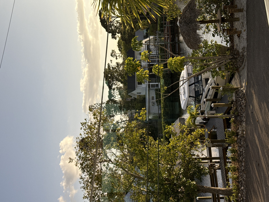 The image displays a residential canal scene in Bonita Springs, United States of America, illuminated by the warm, golden light of late afternoon or early evening under a sky with scattered clouds. The immediate foreground features a dark paved surface leading to a gravel area edged by a low rock wall and green shrubs. A multi-section wooden dock, anchored by pilings, extends into a narrow waterway on the left. A white and grey recreational motorboat with a hardtop is secured to this dock. Dense green trees and foliage are prominent throughout the foreground and mid-ground, partially obstructing views. Multiple utility lines run horizontally across the upper mid-ground. On the right bank of the canal, a small tiki hut with a thatched roof shelters a wooden table and two stools, surrounded by lush greenery. In the background, several residential houses, including a two-story light-colored dwelling with a dark roof and white-railed porch, line the opposite side of the canal, set amidst abundant tree cover. No persons are present.