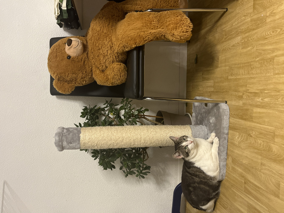 A brown teddy bear rests on a black chair. Below it, a green potted plant sits beside a cat tree. A white and grey cat relaxes on the cat tree's platform, looking upwards. The background consists of a white wall and wooden flooring. A sports bag hangs above the teddy bear.