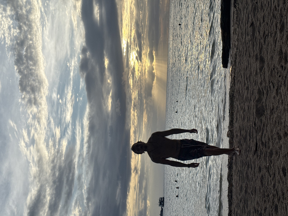 The image depicts a beachfront scene in Tambon Ko Tao, Thailand, during what appears to be late afternoon or early evening, characterized by warm light on the horizon and sunbeams piercing through clouds. A male individual is the primary subject, positioned centrally, walking out of the water onto a sandy beach. He is shirtless and wears dark, patterned swim trunks. His body is largely silhouetted against the brighter background, with features obscured. He is barefoot, has medium-length hair, a dark wristband on his left wrist, and a thin necklace. His gaze is directed forward. The foreground consists of dark, wet sand transitioning to a calm body of water. Along the waterline on the right, a dark, elongated object, possibly a log or debris, is partially submerged. In the mid-ground, within the water, several small, dark shapes, consistent with human heads of swimmers, are visible. To the far left, a multi-decked boat, predominantly white, is anchored further offshore. The horizon line features a bright, warm glow with distinct sunbeams extending downwards through layered clouds. The sky above consists of varied cloud formations, darker near the horizon and lighter towards the top of the frame.