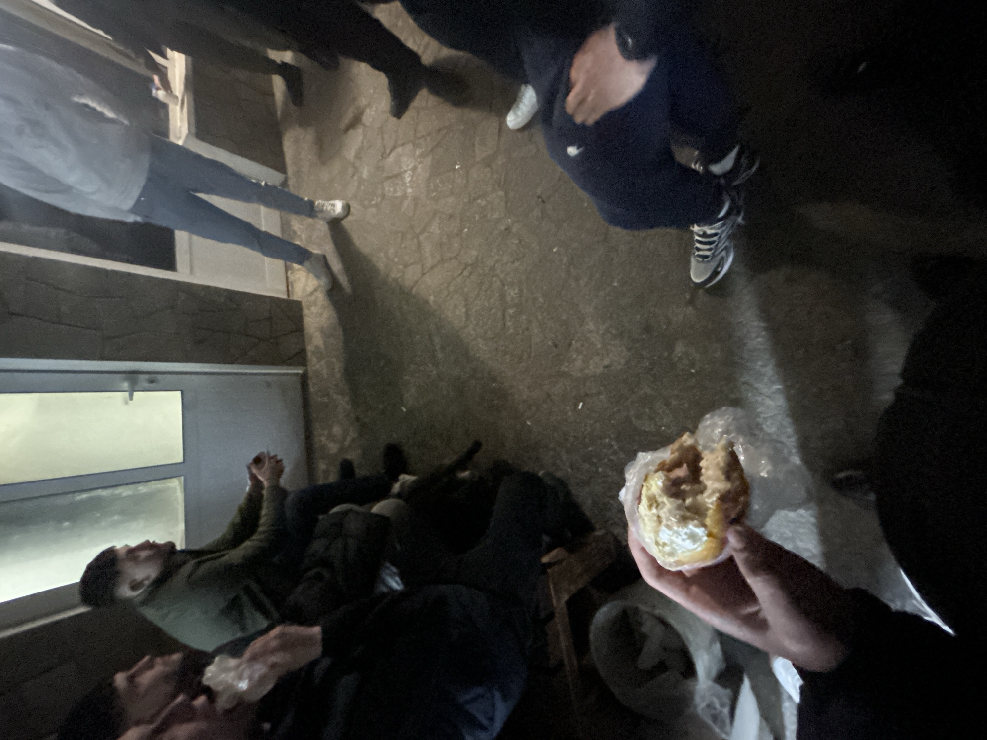 group of people in an outdoor setting, possibly in Startsevo, Bulgaria. Several individuals are lying down near a doorway, appearing to be resting or sleeping. One person is holding a partially eaten sandwich in a plastic wrapper. Other individuals are standing around. The ground is paved and the lighting is dim, suggesting it is nighttime or a poorly lit area. The setting appears to be an urban area, possibly an alley or courtyard.