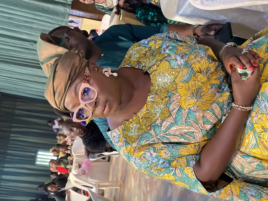 An adult Black female, seated indoors in what appears to be an event hall in Barakin Lerawi, Nigeria, is depicted in the foreground