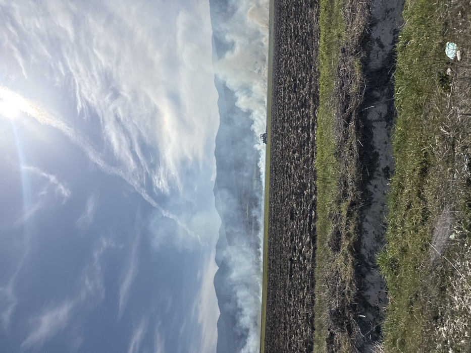 The image depicts a rural agricultural landscape near the city of Малко Белово, Bulgaria, under a bright, sunny sky with scattered cirrus clouds and a prominent contrail. In the foreground, a strip of dry and green vegetation borders a shallow ditch or embankment, beyond which lies a large expanse of dark brown, tilled soil. In the midground, multiple plumes of white and light grey smoke rise from various points across a field, indicating controlled agricultural burning. A single light-colored tractor is positioned on the right side of this field, amidst or adjacent to the smoke, facing towards the right. In the distant background, a range of hazy mountains extends across the horizon. A light blue plastic item is visible on the ground in the lower right corner. No people are visible.