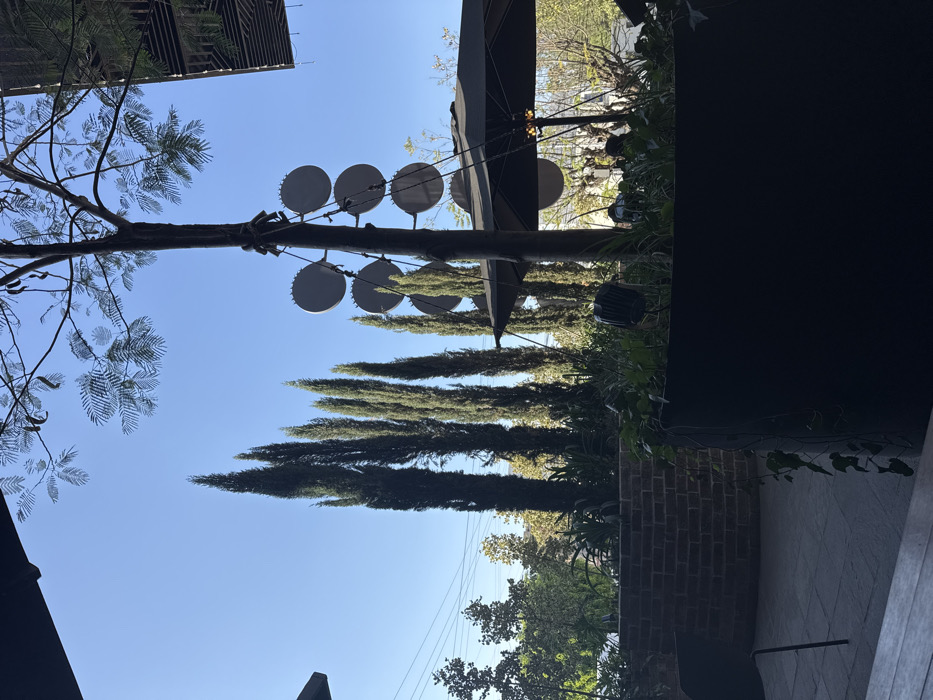 The image captures an outdoor patio or terrace scene in the city of León, Mexico, under a clear, bright blue sky. In the foreground, a dark, rectangular planter box or partition runs across the lower portion, with some green ivy trailing downwards. A light-colored wooden surface, possibly a tabletop, is visible in the bottom left corner. Dominating the midground are several tall, slender, dark green coniferous trees, specifically cypress trees, standing prominently against the sky. To the right, a tree with a dark trunk stands, adorned with six circular, light-colored, dish-like objects arranged in two vertical columns of three, secured by dark straps. A large, dark-colored patio umbrella is open, extending from the right side of this tree, partially obscuring the background. Behind the foreground elements, a brick retaining wall is visible, topped with various green plants and shrubs. In the further background, additional deciduous trees and electrical power lines are discernible against the horizon. The upper right corner reveals a dark, horizontally slatted architectural feature, possibly part of an overhead structure or building facade. The scene is illuminated by strong natural daylight. No individuals are depicted, and no explicit actions or interactions are occurring.