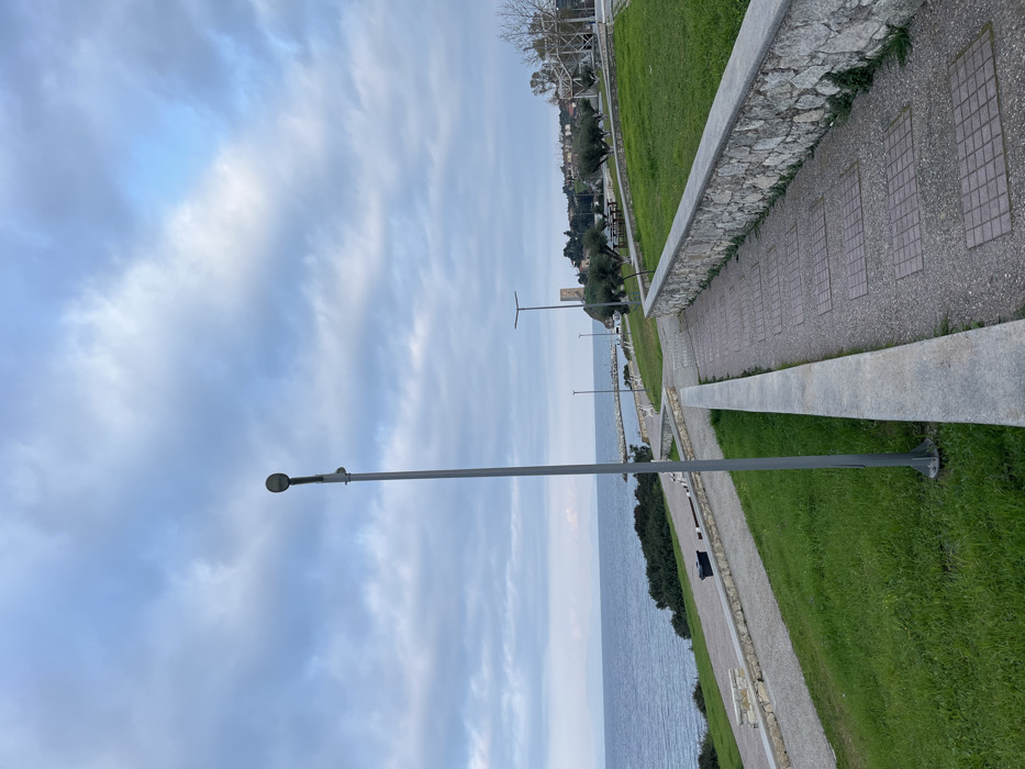 The image displays a coastal park scene in Nea Fokea, Kassandra Municipal Unit, Greece, under an overcast sky. A tall, slender grey metal lamppost stands vertically in the center-left foreground, anchored in a grassy area. To its immediate right, a grey concrete pathway with embedded reddish-brown rectangular pavers extends into the distance, bordered on the right by a low stone wall topped with a concrete cap. To the left of the lamppost, a lower, parallel concrete path is partially visible, featuring a dark trash receptacle and a light-colored bench. Both pathways curve gradually to the right and upward, leading towards the mid-ground. To the left of the paths, the calm, blue Aegean Sea is visible, with a rocky breakwater extending into the water further along the coastline. Additional lampposts are spaced along the pathways. In the mid-distance and background, a hillside town is visible. A prominent light-colored, square stone tower, identified as the Tower of Nea Fokea, sits atop the highest point of the hill. Surrounding the tower and descending the hillside are residential structures and scattered trees. To the right of the pathways, a manicured green park area contains several small, neatly trimmed trees and a white, angular metal structure. The sky is predominantly covered with patchy light grey and white clouds, with small areas of blue visible through gaps. No individuals, actions, or interactions are discernible in the frame.