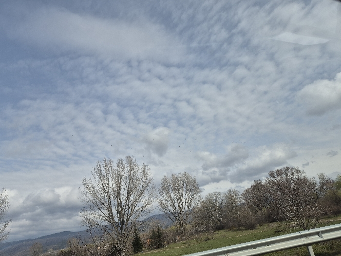 The image displays an outdoor landscape scene, observed from a vehicle, likely near the city of Sliven, Bulgaria. The upper two-thirds of the frame are occupied by a predominantly light blue sky patterned with extensive white and grey altocumulus clouds, with larger cumulus clouds present towards the right. A flock of approximately two dozen small, dark birds is visible in flight across the sky in the upper-mid-left quadrant. The midground consists of a gently sloped, green grassy field interspersed with patches of light brown vegetation. Numerous deciduous trees, largely bare of leaves or with very nascent foliage, are scattered throughout the midground, suggesting an early spring season. Distant, dark blue-grey mountains or hills form the horizon line in the background. A silver-colored metal guardrail runs diagonally across the lower portion of the image, extending from the bottom-left to the bottom-right, indicating proximity to a road. A rectangular reflection, consistent with a vehicle's window, is present in the upper-right corner of the frame. No human figures are visible.