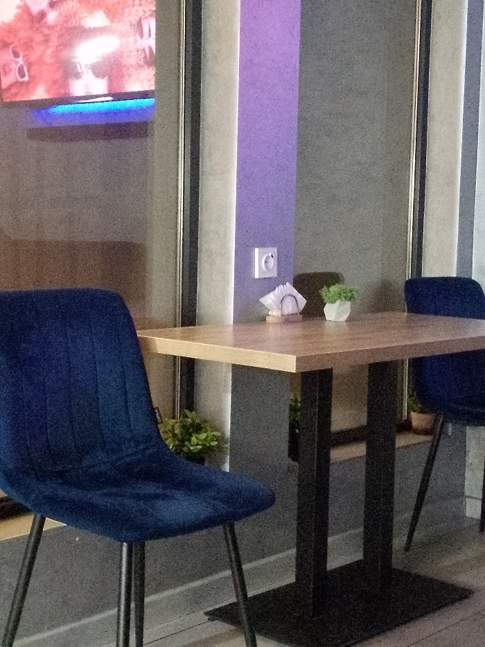 A navy blue velvet chair faces a square, light-colored wooden table with a black metal base. Another blue chair sits opposite, partially visible. The table holds a tissue holder and a small potted plant. Behind the table, a wall is divided into gray and purple sections, with a white electrical outlet visible on the purple part. A television screen is seen in the background, reflecting in a mirrored panel. Green plants are situated on the floor beneath the table.