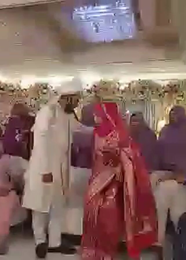 man in a white outfit and turban, possibly a groom, standing next to a seated woman in a red and gold dress and head covering, potentially the bride. They are surrounded by a group of seated women, most of whom are wearing purple head coverings. The man bends down as if adjusting something on the woman's dress. The setting appears to be a formal event, possibly a wedding reception, with floral decorations and a chandelier visible in the background. The camera angle is slightly low, looking up at the scene.
