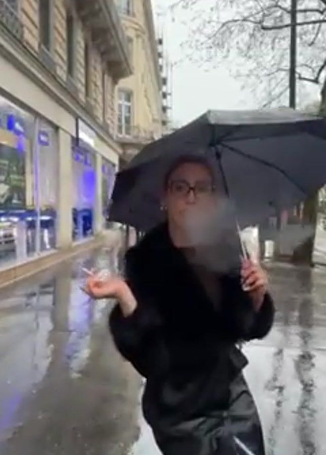 A person in a black coat, black pants, and black boots, holding a black umbrella, stands on a wet sidewalk in what appears to be a city. The person turns to face the camera, says "Bonjour", and then walks down the sidewalk with the umbrella. The street and sidewalk are wet, suggesting it has been raining. Buildings line the street and bare trees are seen alongside the sidewalk. There are other people visible in the background walking. The umbrella has white writing on it, reading "Bien au Sec!". The person appears to be smoking. The scene is outdoors, and the weather is overcast.