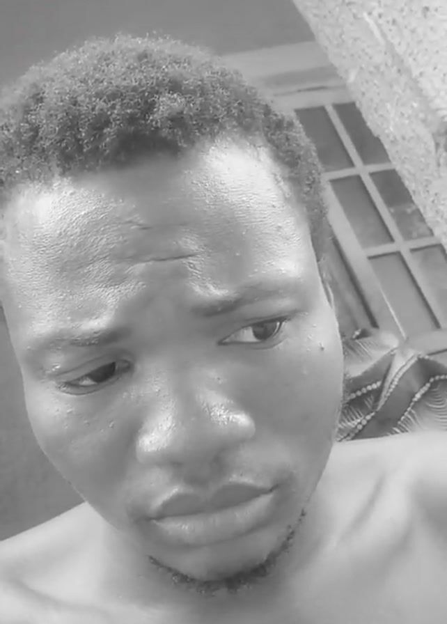 A close-up, black and white video shows a man with short, curly hair, a goatee, and bare shoulders. He looks down, then up at the camera with a pout. A window is visible in the background.