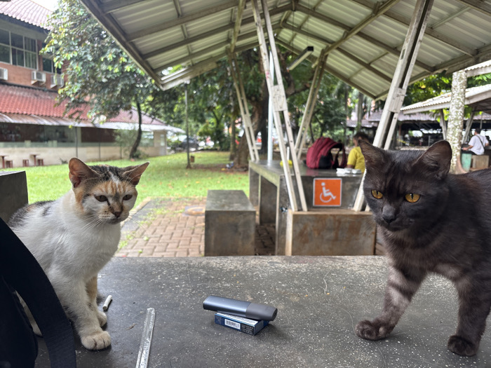 Two cats occupy a gray table under a covered outdoor area. A white and brown cat sits to the left, facing forward with a solemn expression. To the right, a black cat with piercing yellow eyes advances toward the viewer. Between them on the table are a cylindrical object and a pack of cigarettes. In the background, people sit at tables under similar structures. Trees and a building are visible beyond the covered area. A sign with a wheelchair symbol is mounted on one of the support structures.