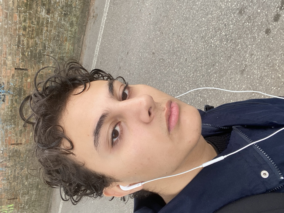 A close-up, slightly elevated selfie depicts a young individual with fair skin and dark, short, curly hair, looking directly at the camera with a neutral expression
