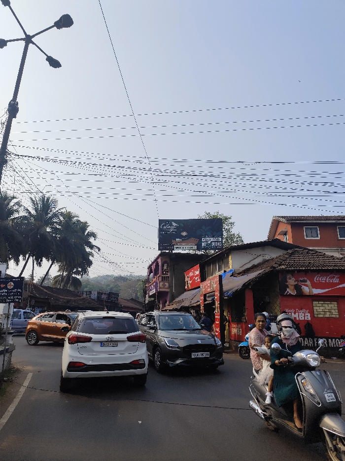 A bustling street scene shows cars and scooters in motion. A white car and a gray SUV are prominent, their license plates partially visible. A woman rides a scooter with a child, both facing forward. Buildings line the street, displaying advertisements, including Coca-Cola. Overhead, a billboard advertises a restaurant. Numerous power lines crisscross the sky, contrasting with the bright, clear sky above. Palm trees are visible on the left.