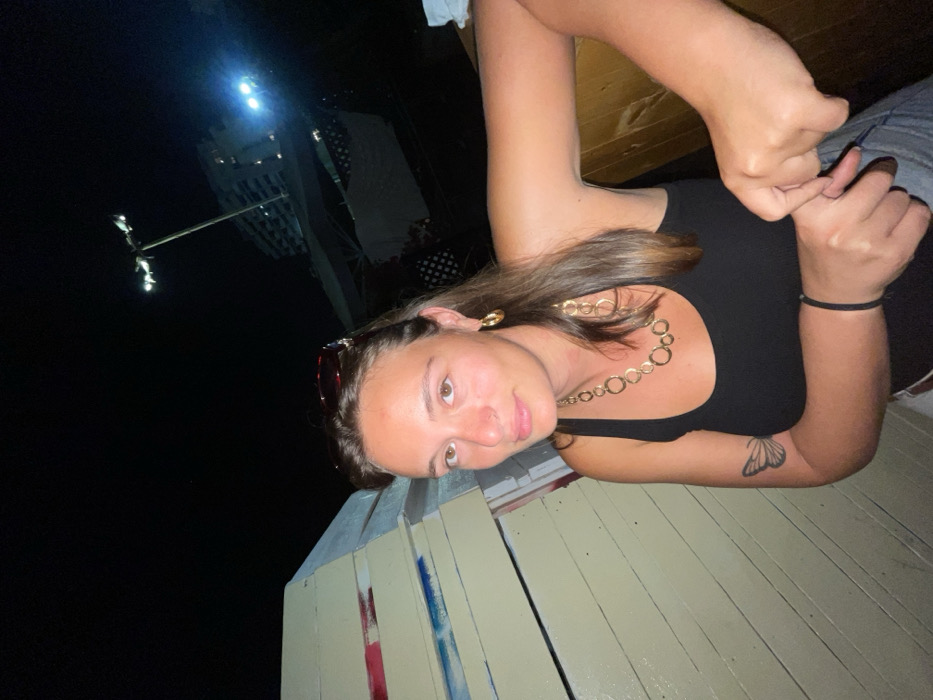 A young adult female is depicted in a medium shot, looking directly at the camera with a slight smile. She has long, dark brown hair, dark eyes, and fair skin with slight redness on her nose. She wears a black tank top, gold-toned hoop earrings, and a gold-toned necklace with interconnected circular links. Red-framed sunglasses rest on top of her head. A black butterfly tattoo is visible on her left upper arm, and a black bracelet is on her left wrist. Her right arm rests on a light-colored wooden surface. Her left hand is positioned near her waist, appearing to be adjusting an item or clothing. To her left, stacked light-colored wooden panels, some with faint remnants of red and blue paint, form a barrier or structure. The background indicates a nighttime outdoor environment, largely dark. A tall pole with multiple bright floodlights is visible to her right, illuminating a multi-story building in the distance. Below the building, a structure with a dark lattice pattern and a light-colored awning or roof is partially visible. The scene is illuminated by artificial light, likely a flash, highlighting the subject. The location is Unknown, Unknown.