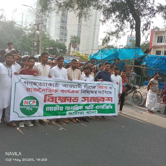 A group of men hold a banner in a street protest. The banner, written in Bengali, calls for justice against the Awami League, banning its political activities. The National Citizen Party (NCP) is identified on the banner along with its regional office in Bhatara Thana. The banner text also mentions a "protest rally." The image includes the text "NAVILA 02 May 2025, 16:22."