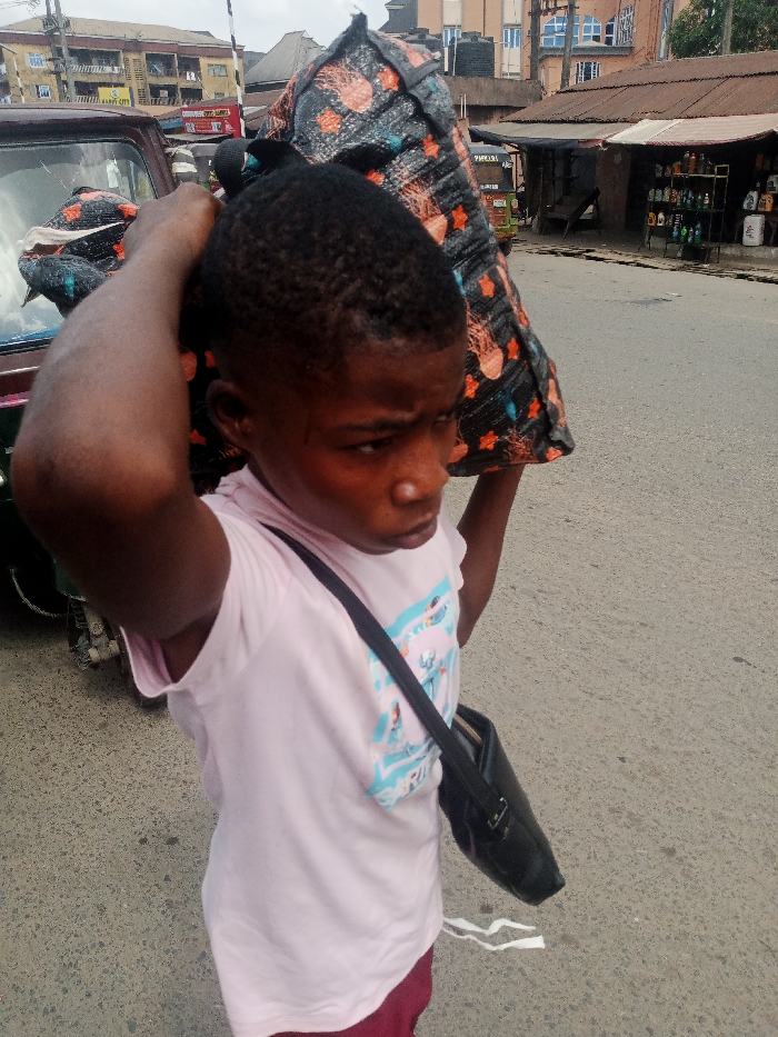 An individual, appearing to be a young male, stands on a gray asphalt street in ARIDICA, Nigeria. He is observed from the chest up, facing forward but looking slightly down and to his right. He wears a light pink short-sleeved t-shirt with a light blue graphic design on the chest and dark red lower garments. A black shoulder bag with a visible strap is slung across his left shoulder, resting on his right hip. Both his hands are raised, supporting a large, dark-colored, rectangular bag positioned on his head. This bag features repeating patterns of orange/reddish shapes, possibly resembling marine life, and scattered light blue elements. To the left, partially visible behind the individual, is a portion of a brown vehicle, likely a tricycle (Keke Napep), with a reflective window. The background reveals an urban environment. On the far left, multi-story buildings are visible, one featuring a sign that reads "ARIDICA CITY." Further right in the background, a single-story structure with a corrugated metal roof functions as a market stall or shop, displaying numerous plastic bottles containing various liquids on shelves. Beyond this stall, additional multi-story buildings are present under an overcast sky. The asphalt road surface exhibits some white linear marks in the foreground.