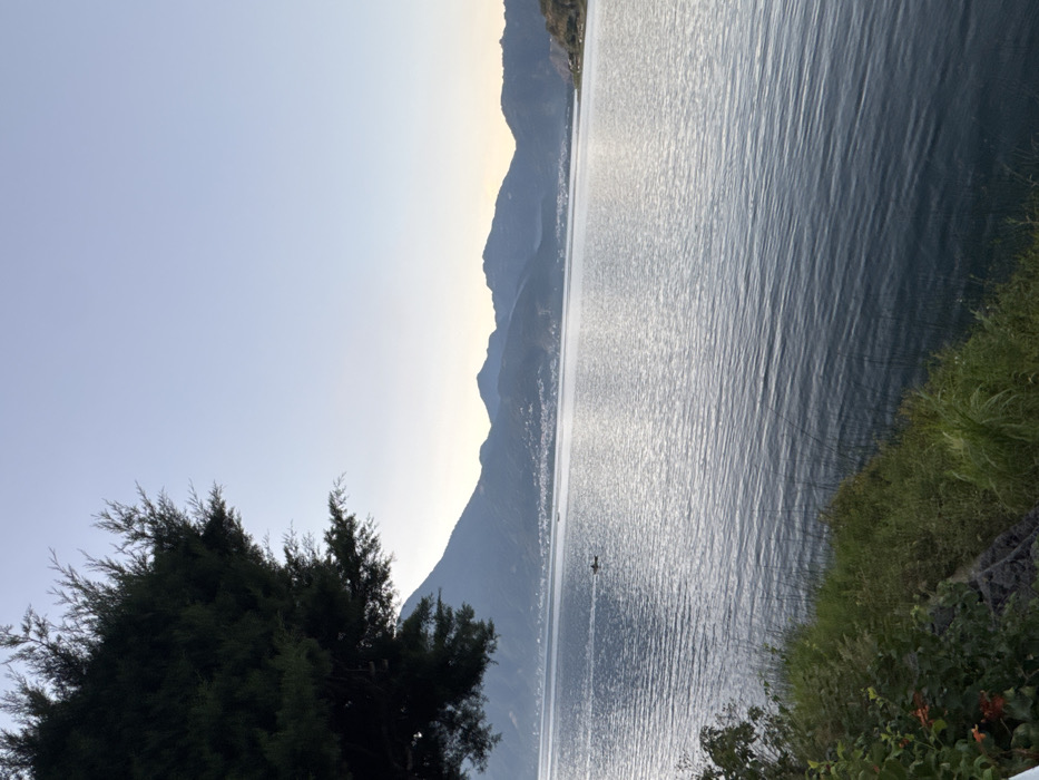 This image displays a wide view of Lake Atitlán from the shoreline of San Pablo La Laguna, Guatemala
