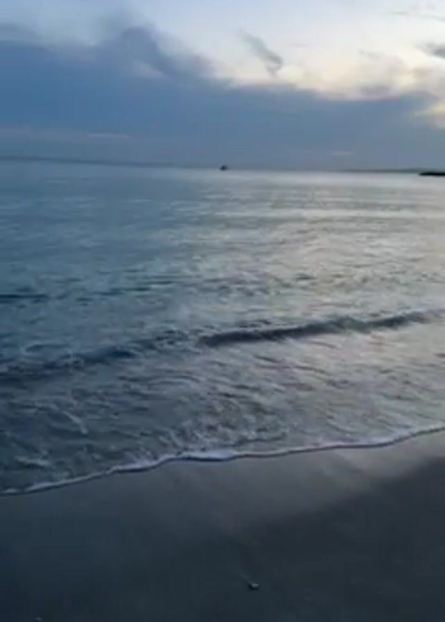 calm beach at twilight. The sand is a dark grey, and gentle waves are washing ashore. The water is a muted blue, blending into the sky which is a mix of blue and grey clouds with hints of sunset. A small boat is visible in the distance on the water.