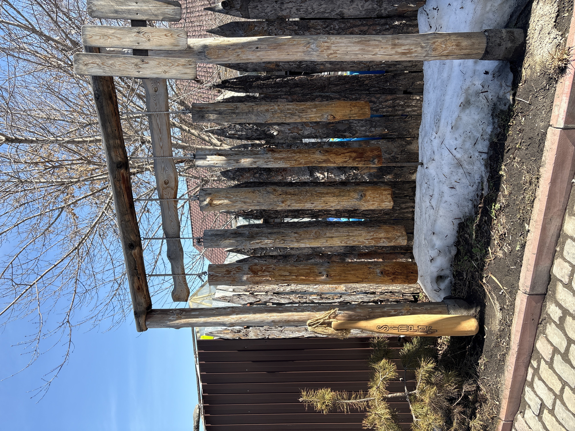 The image depicts an outdoor scene in Bely Klyuch, Russia, featuring a rustic wooden chime or musical instrument structure. In the center, a horizontal, rough-hewn log beam is supported by three vertical wooden posts—one on the left and two on the right—all appearing to be natural, unrefined logs. From this horizontal beam, five substantial, rectangular wooden planks or logs are suspended by ropes, functioning as chimes. Behind this structure, a dual-material fence is visible: a dark brown corrugated metal fence on the left, transitioning to a tall palisade-style wooden fence composed of vertically arranged, pointed logs on the right. Beyond the fence, a bare deciduous tree with a dense network of branches stands against a clear, vibrant blue sky. Portions of a reddish-brown tiled roof and a translucent greenhouse structure are also visible in the background. In the foreground, an irregular patch of melting snow covers the ground beneath the wooden chime structure, with dark, exposed soil and sparse dry grass visible around it. To the far left, a small, bushy coniferous plant is rooted in the soil. Immediately to the left of the leftmost vertical post, a tall, slender, light-colored wooden carving or marker stands upright. It features vertical carved text, possibly "SIMPOR" or a Cyrillic equivalent, and has a decorative element resembling braided rope attached to its top. The immediate foreground shows a light-colored cobblestone path bordered by a reddish-brown curbstone on the left. The scene is illuminated by direct sunlight, casting shadows. No individuals are present.