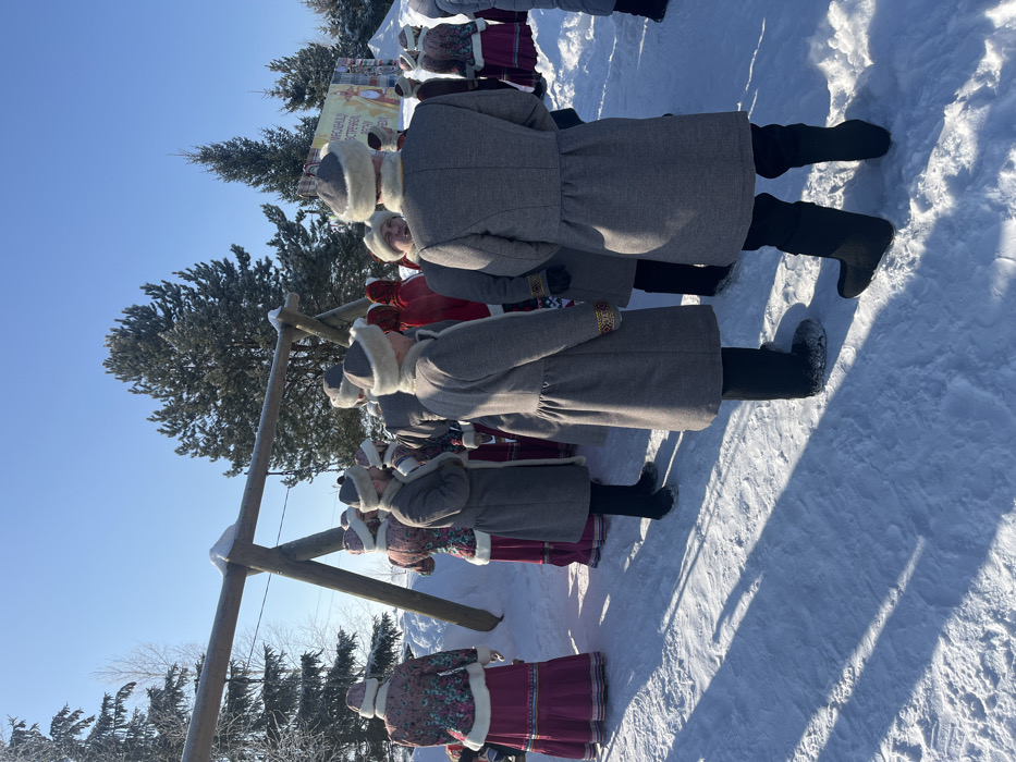 The image depicts an outdoor winter scene in Ludorvay, Russia, under a clear blue sky with bright sunlight casting prominent shadows on the snow-covered ground. A group of approximately fifteen to twenty individuals is gathered, dressed in traditional Russian attire. Several men are visible from the back or side, wearing long, gray/beige coats with pleated backs, black pants, and fur-lined hats. Some coats feature decorative embroidery on the sleeves. Women are dressed in vibrant traditional costumes, including long, pleated, deep magenta/red skirts with decorative hems and blouses or jackets adorned with intricate floral patterns in pink, green, and blue. They also wear fur-lined hats similar to the men's. One woman in a bright red garment is partially visible. In the mid-ground, a large, rustic wooden A-frame swing set structure, partially covered in snow, stands upright. In the far background, behind the group, pine trees are visible, some dusted with snow. A colorful banner with Cyrillic text is discernable in the distant background, suggesting an event or festival. The individuals are standing in a loose formation, facing generally towards the right side of the frame, appearing to observe or gather.