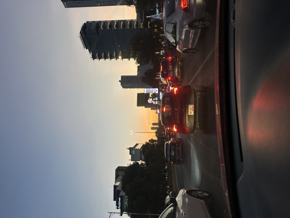 Traffic congestion in an urban setting is captured during twilight. Buildings and billboards punctuate the horizon, illuminated by the last rays of the setting sun. Various cars line the road, with the tail lights of a red car in the foreground, featuring a license plate with the number TWP-081-A. The interior of a vehicle is visible on the side, suggesting the perspective is from a driver or passenger.