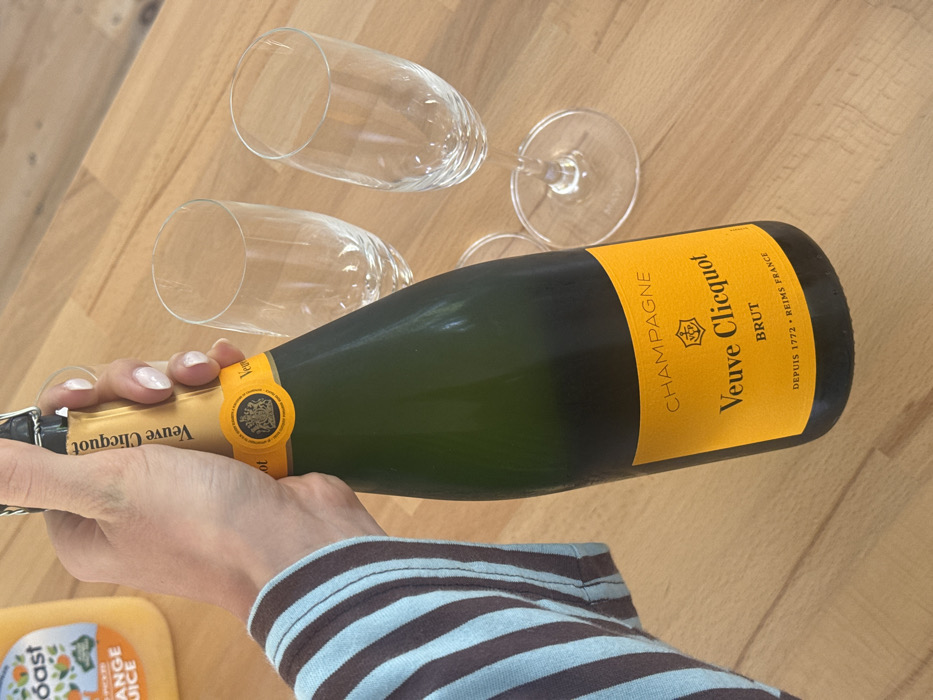 A person holds a bottle of Veuve Clicquot champagne, poised to pour. Two empty champagne flutes sit on a wooden surface. The bottle's yellow label is prominently displayed. A container of orange juice is partially visible in the corner. The person is wearing a striped shirt with brown and light blue stripes. The overall scene suggests a celebratory occasion or a brunch setting.