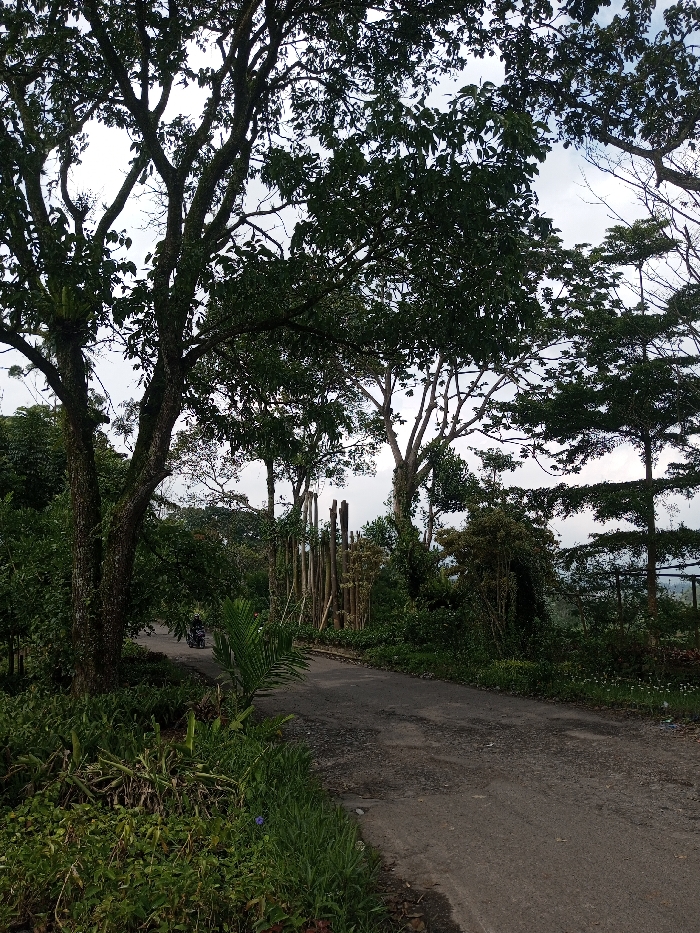 The image displays an outdoor scene of a narrow, worn asphalt road in Sandamal Eliya, Sri Lanka, bordered by dense tropical vegetation under an overcast sky. The road, which shows signs of cracking and patching, curves gently to the left and extends into the background. In the left foreground, a prominent tree with a thick, dark trunk and rich green foliage stands, hosting an epiphytic plant on its lower branches. Other large trees with various leaf patterns and trunk structures frame the road, their canopies largely obscuring the sky. Lush green undergrowth, including broad-leafed plants, ferns, and grasses, densely covers the ground along both sides of the road. In the mid-ground, positioned on the left side of the road and partially obscured by foliage, a dark-colored motorcycle is visible, appearing stationary and facing away from the viewer. To the right of the road, further into the mid-ground, a rustic structure composed of several vertical wooden posts or logs stands amidst the greenery. The background reveals more trees and a hazy, distant landscape, likely hills, under a uniformly grey, overcast sky. No individuals are discernible within the frame.